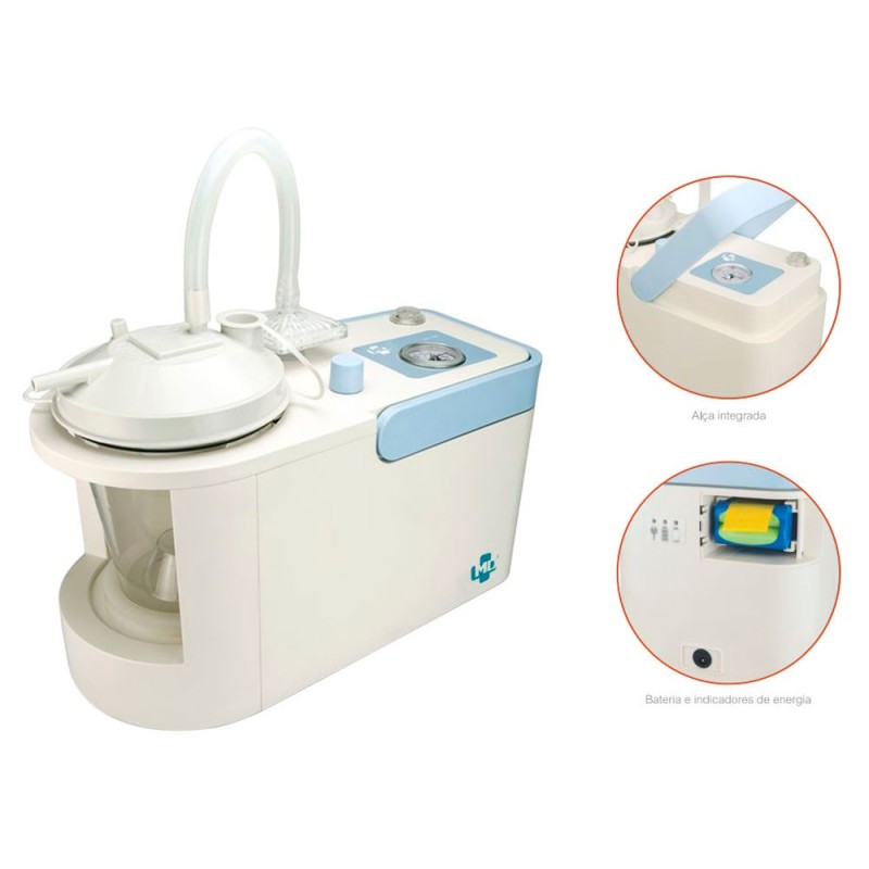 Aspirador portátil e versátil de alto vácuo, indicado para sucção de secreções, fluidos corporais, corpos estranhos nas áreas nasais, faringe e traqueia. Cria uma pressão negativa (vácuo) que extrai os fluidos através de tubos descartáveis que estão conectados a um recipiente.