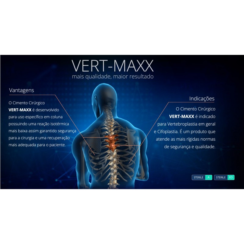 O cimento cirúrgico é indicado nas cirurgias de vertebroplastia, cifoplastia e preenchimento de cavidade em cirurgias oncológicas. Cimento ósseo para coluna vertebral, de base acrílica com baixa viscosidade e alto índice de radiopacidade devido ao excelente nível de concentração de Sulfato de Bário. O Cimento Cirúrgico Vert-Maxx pode ser considerado um dos mais seguros devido a seus índices apontarem uma reação isotérmica mais baixa.