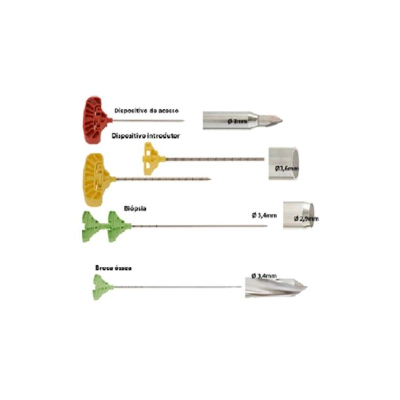 Cânulas para acesso vertebral Allevo: através do conjunto de cânulas para acesso vertebral, constando de 2 cânulas para acesso vertebral, 11 G x 11 cm; 2 pinos guia com ponta cega com 26 cm de comprimento; 2 pinos guia com ponta cortante com 26 cm de comprimento; 1 cânula de introdução vertebral, 8 G x 12 cm, graduada; 1 cânula de biópsia óssea 8 G x 12 cm, ponta cônica e 1 cânula com broca óssea 10 Fr, todos fabricados em aço inoxidável AISI 304;