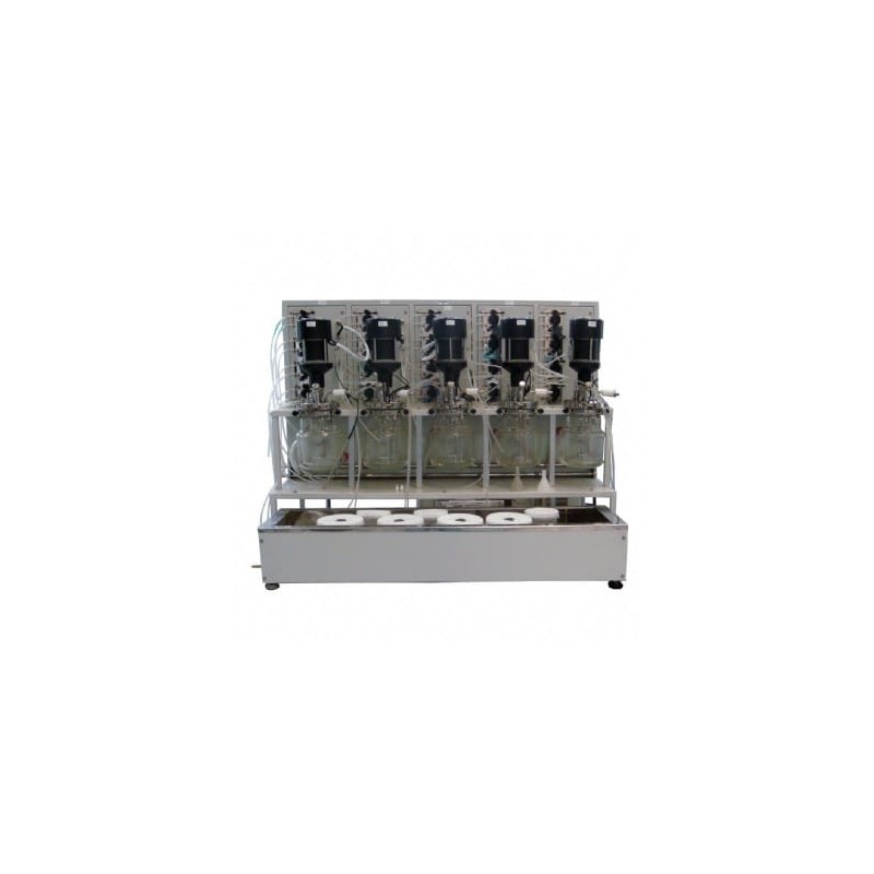 - capacidade para abrigar 5 vasos recipientes de reação sob agitação independentes, 5 recipientes de alimentação comandados por bombas peristalticas e 5 recipientes de coleta