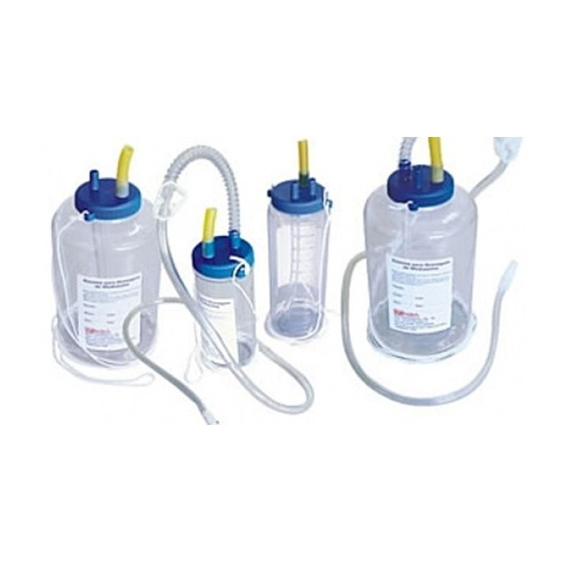Frasco em PVC rígido transparente, (graduado cada 50ml, temos opção de graduação cada 100 ml) conforme solicitação do cliente, capacidade de 70, 120, 250, 500, 1000, 2000 e 3500 ml tampa rosca com 3 saídas, selo de água com tubo em PVC, intermediário em plástico e extensão para dreno em PVC cristal transparente e flexível com 120 cm de comprimento, válvula anti-refluxo, pinça corta-fluxo e conexão em elastômero, outra saída para o tubo de vácuo e alça para transporte e fixação. Opcionais: Base de sustentação, filtro hidrofóbico, fecho obturador, batoque, fita para controle de drenagem, mola plástica, conector escalonado, conector para dreno. Comprimento e diâmetro interno e externo da extensão e do dreno torácico, podendo ser fabricado de acordo com a necessidade do hospital.