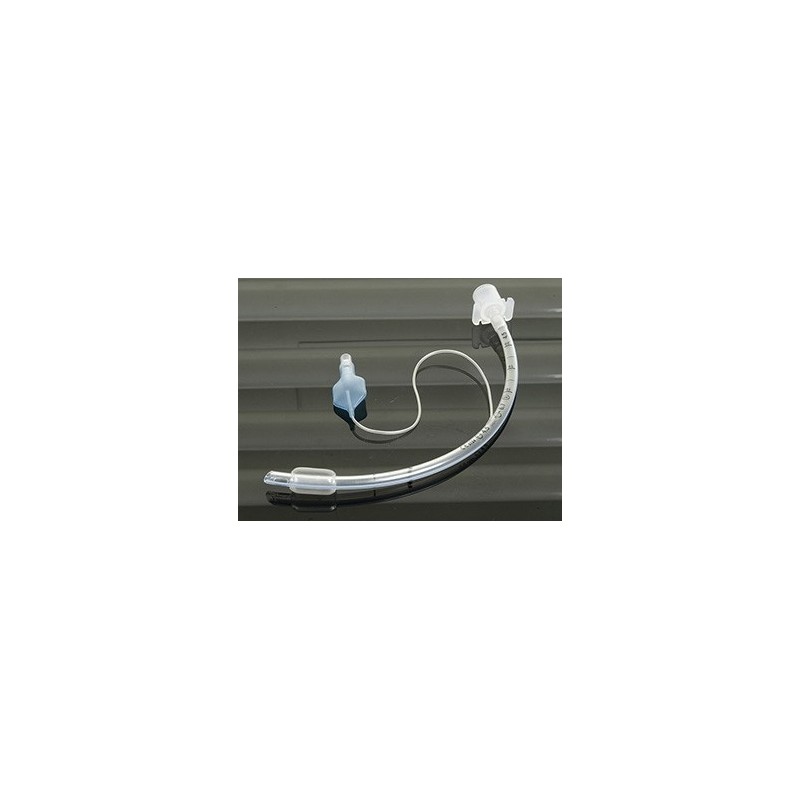 Sonda endotraqueal em PVC termosensível descartável e transparente com balão pré-moldado de baixa pressão e alto volume, balão azul de controle de pressão com válvula de segurança e encaixe para seringas Luer e Luer-Lock, conector semi-montado, linha radiopaca contínua, graduado, extremidade distal retraída e atraumática com orifício lateral MURPHY, para intubação oral ou nasal, estéril, “Látex Free”.