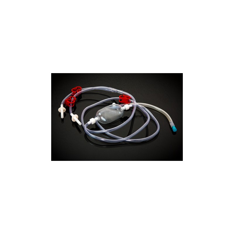 Bomba unidirecional valvulada em forma de balão. Utilizado para irrigação manual controlada, com tubo de polietileno flexível transparente de 220 cm de comprimento.