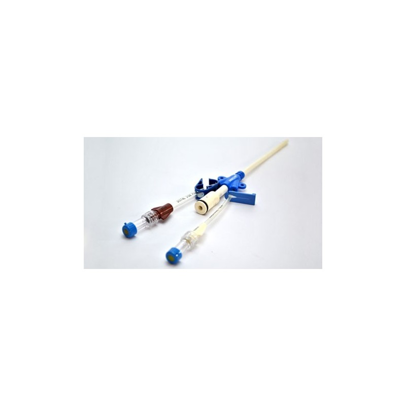 Cateter para hemodiálise em poliuretano II radiopaco, com ponta Blue Flex Tip®, seringa de Raulerson® sistema advancer de fio guia, clamp duplo de fixação do cateter, kit de punção (agulha, dilatador e fio guia)