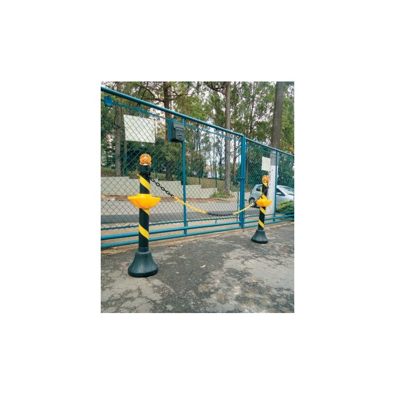 Pedestal confeccionado em material plástico de alta durabilidade (base - PE, corpo - PVC, tampa - PC) com base preenchida em concreto e ganchos metálicos para fixação de correntes ou barras de isolamento e alça para transporte seguindo regras de ergonomia e segurança.